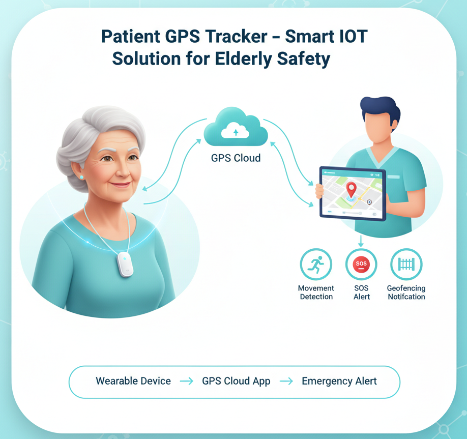 The Patient GPS Tracker is a smart, IoT-enabled device designed to enhance the safety of dementia and elderly patients. It provides caregivers with real-time tracking, movement detection, and emergency alert notifications, ensuring timely intervention and continuous patient monitoring.